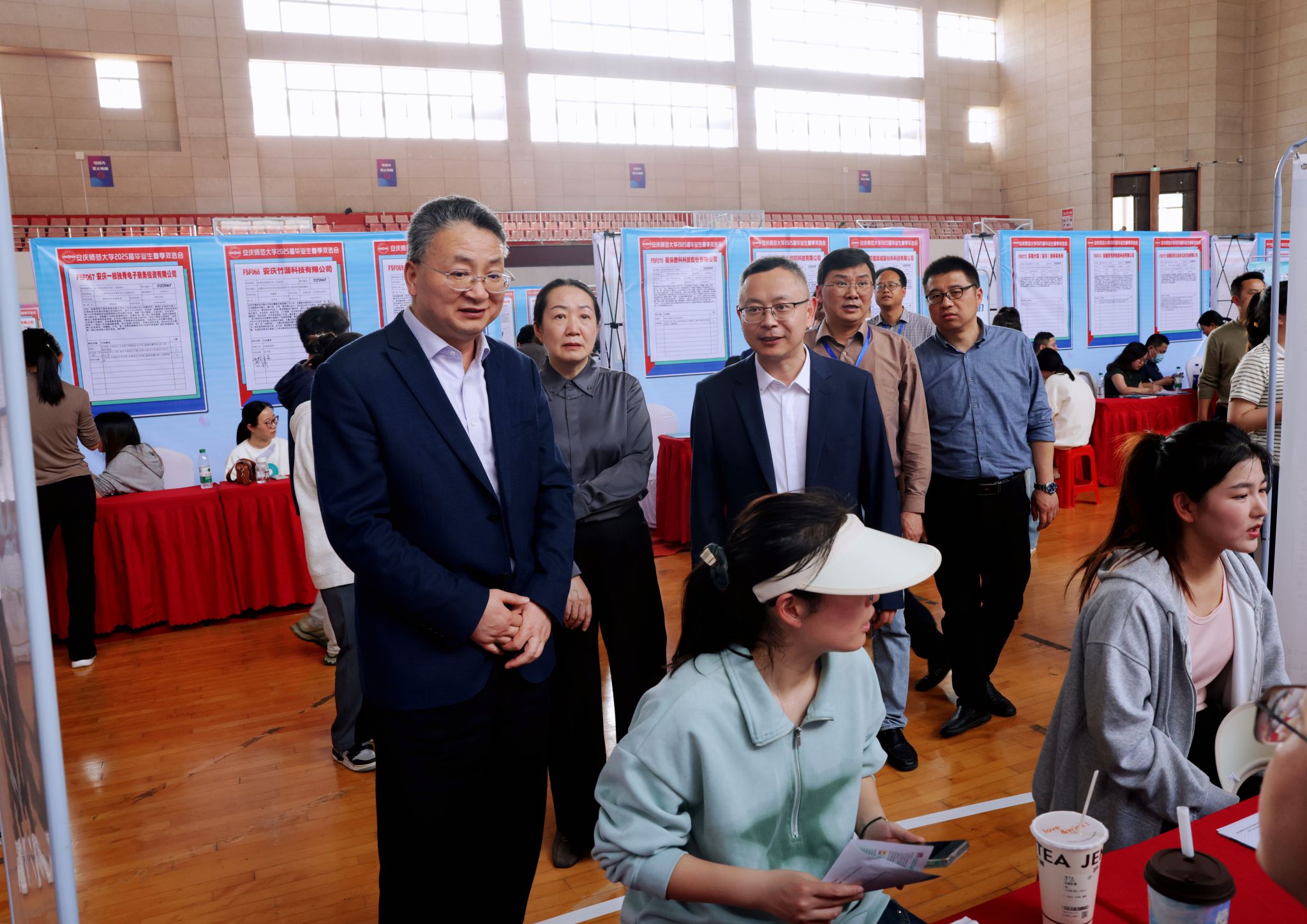 校党委书记李福华,校党委常委、副校长吴琼、徐晓宁到双选会现场进行指导调研,与用人单位招聘人员深入交流,了解企业人才需求情况,询问毕业生就业意向与求职进程,并对毕业生进行就业指导。